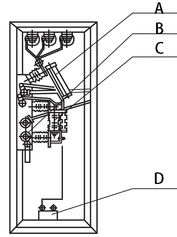 ![]() | Gambar 3 Gambar 3 A:: S Sekering (gerbang pisau isolasi) B: Mekanisme kontrol peluru C: Load switch D. D. D. D.: Transformator arus |