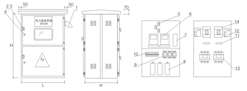 1. Kabel masuk melalui pipa 2, kunci pintu (kunci terbuka) 3, kotak hujan kunci pintu 4, kunci pintu (kunci tersembunyi) 5, trafo arus 6, meter 7, kotak persimpangan 8, kapasitor 9, beralih kontaktor menyatu 10, pemutus sirkuit kecil 11, sakelar isolasi 12, trafo urutan nol 13, pemutus sirkuit arus kebocoran 14, kontaktor A:C keluar 15, sakelar udara keluar